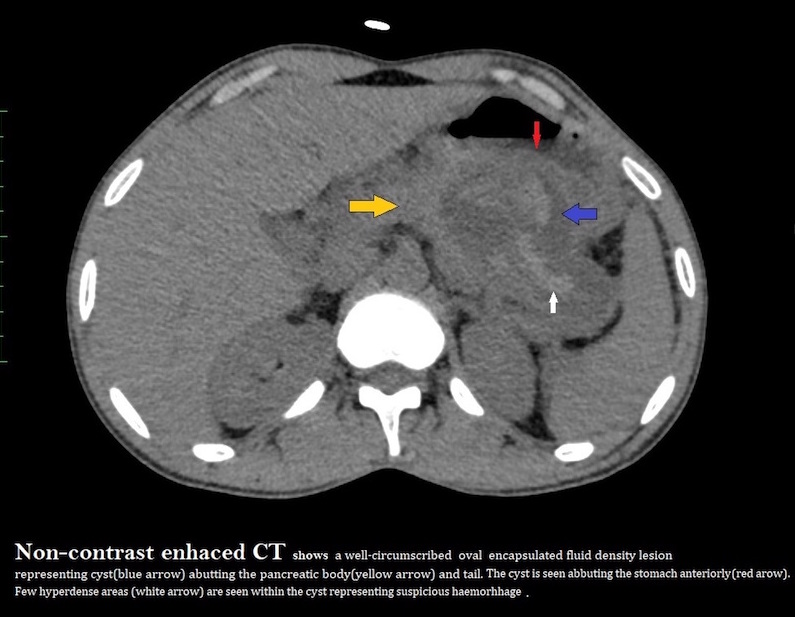 A well-defined oval cyst isseen abutting the pancreatic body and tail, suggestive of a pancreatic pseudocyst. The pancreatic duct is minimally prominent. Thecyst is seen anteriorly abutting the stomach wall with resultant diffuse oedematousthickening of the walls of the stomach.A few ill-defined hyperdensitiesare seen within the cyst, suggestive of chronic hemorrhages/ sludge •Atiny nodular well-defined intensely enhancing lesion is seen along the cyst wall anteriorly on arterialphase representing peseudoaneurysm.